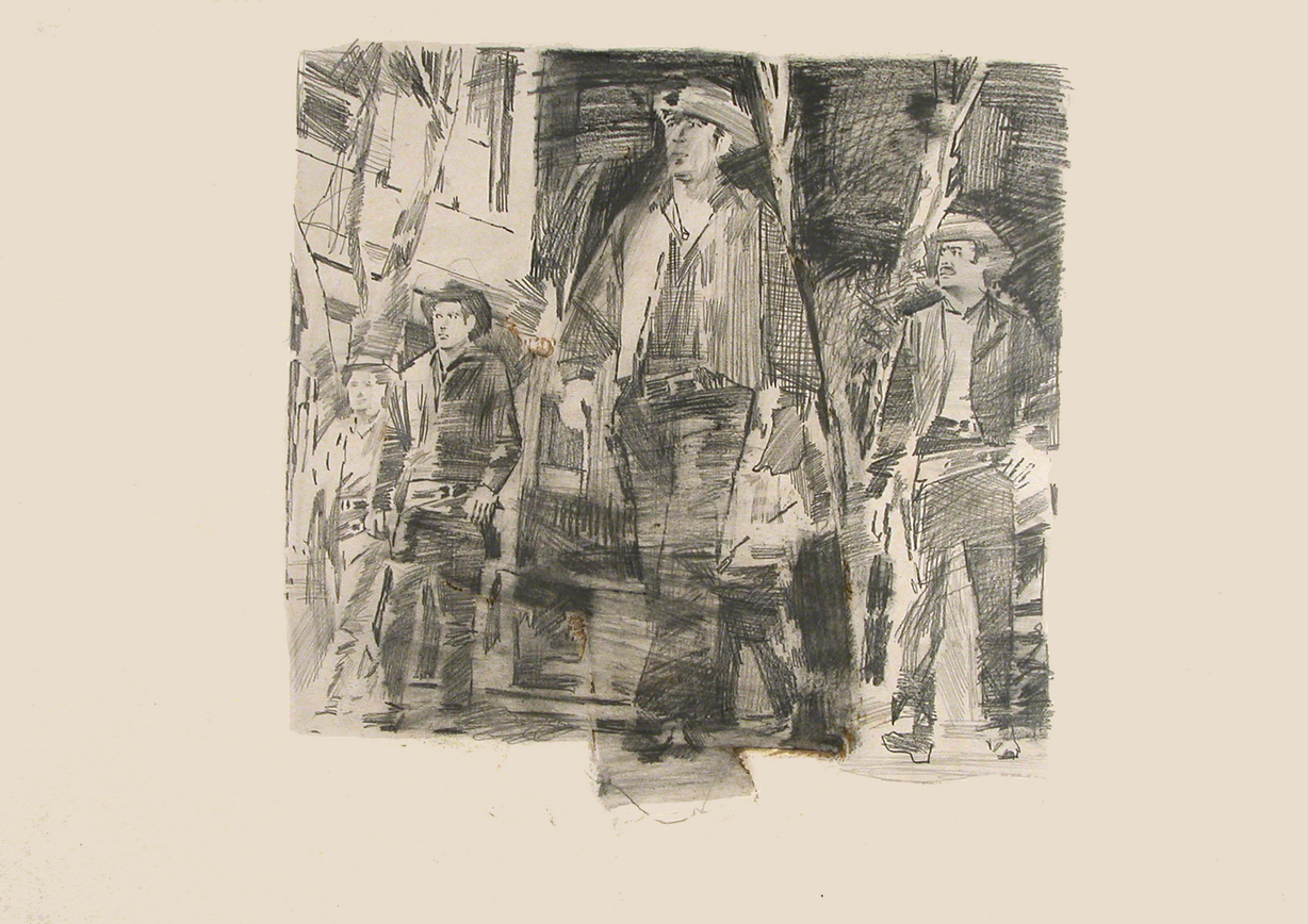 A multitude of subjects, whether childhood memories from a 1960’s middle-class “suburbia” in Utah or a recent front-page photo of the latest Wall Street swindler, seems to post no limits as to origin or timeframe. All of his images are icons of everyday life of both past and present. A post-industrial urban landscape blurs into the wide forested horizon of Wyoming, the American West. Faded photographs share space with modern-day Italian gangsters and politicians. A miserable character extracted from Goya’s Disasters of War meets Tex Willer and John Wayne. Several Playboy Bunnies and a Singer sewing machine are alongside late-night movie heroes with baseball players. One of these images alone is not mysterious, but collected, the “memorabilia” in these drawings is disquieting and revelatory.